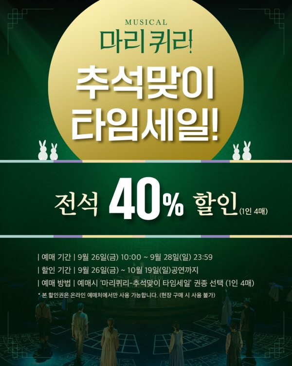 ÀÌ¿¡ ¹ÂÁöÄà ¡®¸¶¸® Äû¸®¡¯´Â ´Ù°¡¿À´Â Ãß¼® ¿¬ÈÞ, ´õ ¸¹Àº °¡Á· ´ÜÀ§ °ü°´¿¡°Ô ¹®È ³ªµéÀÌ °æÇèÀ» ¼±¹°ÇϰíÀÚ Æ¯º°ÇÑ Å¸ÀÓ¼¼ÀÏ À̺¥Æ®¸¦ ÁøÇàÇÑ´Ù. ¿À´Â 9¿ù 26ÀϺÎÅÍ 9¿ù 28ÀϱîÁö ¿Â¶óÀÎ ¿¹¸Åó(NOL ƼÄÏ, ¿¹½º24ƼÄÏ)À» ÅëÇØ °ø¿¬À» ¿¹¸ÅÇϸé, 9¿ù 26ÀϺÎÅÍ 10¿ù 19ÀϱîÁöÀÇ °ø¿¬À» Àü¼® 40% ÇÒÀΰ¡¿¡ ±¸¸ÅÇÒ ¼ö ÀÖ´Ù. ¿¹¸Å ½Ã ¡®¸¶¸®Äû¸®-Ãß¼®¸ÂÀÌ Å¸ÀÓ¼¼ÀÏ¡¯ ±ÇÁ¾À» ¼±ÅÃÇϸé ÇÒÀÎÀÌ Àû¿ëµÇ¸ç, 1Àδç 4¸Å±îÁö ±¸¸Å °¡´ÉÇÏ´Ù.