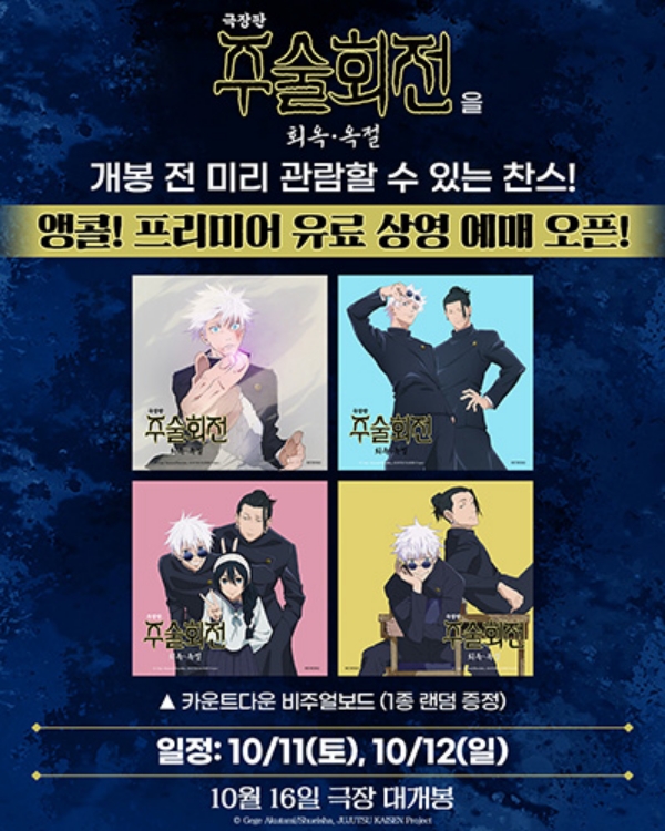 ÀÌ·± ¼º¿ø¿¡ ÈûÀÔ¾î ¾ÞÄÝ ÇÁ¸®¹Ì¾î »ó¿µÈ¸°¡ °³ºÀ 1ÁÖ ÀüÀÎ 10¿ù 11ÀÏ(Åä)°ú 12ÀÏ(ÀÏ) CGV, ·Ôµ¥½Ã³×¸¶, ¸Þ°¡¹Ú½º¿¡¼ ÁøÇàµÈ´Ù. °ü¶÷°´ Àü¿ø¿¡°Ô´Â '±ØÀåÆÇ ÁÖ¼úȸÀü: ȸ¿Á∙¿ÁÀý'ÀÇ ÇÙ½É Àι° ¡®°íÁÒ »çÅä·ç¡¯, ¡®°ÔÅä ½º±¸·ç¡¯, ¡®¾Æ¸¶³ªÀÌ ¸®ÄÚ¡¯·Î ±¸¼ºµÈ ¡®Ä«¿îÆ®´Ù¿î ºñÁ־󺸵塯 4Á¾ Áß 1Á¾ÀÌ ·£´ý ÁõÁ¤µÉ ¿¹Á¤ÀÌ´Ù. ¿©±â¿¡, ¸Þ°¡¹Ú½º »ó¿µ°ü¿¡¼´Â ¿¬³» °³ºÀ ¿¹Á¤ÀÛÀÎ '±ØÀåÆÇ ÁÖ¼úȸÀü: ½ÃºÎ¾ß»çº¯ X »ç¸êȸÀ¯'ÀÇ ¿¹°íÆíÀÌ ¼±°ø°³µÈ´Ù´Â ¼Ò½Ä±îÁö ÀüÇØÁö¸ç °ü°´µéÀÇ ¶ß°Å¿î ¹ÝÀÀÀÌ À̾îÁö°í ÀÖ´Ù. Ãß°¡ ÇÁ¸®¹Ì¾î »ó¿µÈ¸ ¿¹¸Å´Â ¹Ù·Î ¿À´Ã 10¿ù 2ÀÏ(¸ñ)ºÎÅÍ °¢ ±ØÀå ȨÆäÀÌÁö ¹× ¾ÖÇø®ÄÉÀ̼ÇÀ» ÅëÇØ ¼øÂ÷ÀûÀ¸·Î ¿ÀǵȴÙ.