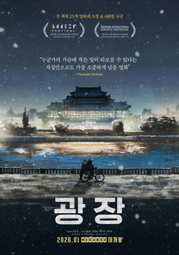 °ø°³µÈ ·ÐĪ Æ÷½ºÅÍ 2Á¾Àº ¿Ü·Ó°í À§ÅÂ·Î¿î ºÐÀ§±â¿¡¼ ÇǾ´Â °¨Á¤µéÀ» Æ÷ÂøÇß´Ù. ¸ÕÀú ù ¹øÂ° ·ÐĪ Æ÷½ºÅÍ´Â ÀÚÀü°Å·Î ´«ÀÌ ³»¸®´Â ±¤ÀåÀÇ ¹ã°Å¸®¸¦ Áö³ª´Â ¡®º¸¸®¡¯¿Í ¡®º¹ÁÖ¡¯ÀÇ ¾ÖƶÇÑ ¸ð½ÀÀ» ´ã¾Æ³Â´Ù. ¡°´©±º°¡ÀÇ °¡½¿¿¡ ÀÛÀº ºûÀÌ Å¸¿À¸¦ ¼ö ÀÖ´Ù´Â »ç½Ç¸¸À¸·Îµµ °¡Àå ¼ÒÁßÇÏ°Ô ³²À» ¿µÈ¡±(The Austin Chronicle)¶ó´Â ¸®ºä±îÁö ´õÇØÁö¸ç, À̺°ÀÌ Á¤ÇØÁø ¡®º¸¸®¡¯¿Í ¡®º¹ÁÖ¡¯°¡ ½×¾Æ ¿Ã¸®´Â °¨Á¤ÀÌ ¾î¶»°Ô ¿¹ºñ °ü°´µéÀÇ ¸¶À½¿¡ »õ°ÜÁúÁö ±Ã±ÝÇÏ°Ô ¸¸µç´Ù. ¶Ç ´Ù¸¥ ·ÐĪ Æ÷½ºÅÍ´Â ±èº¸¼Ö °¨µ¶ÀÇ Ä£ÇÊ ¸Þ½ÃÁö·Î ½Ã¼±À» »ç·ÎÀâ´Â´Ù. ¿ÃÇØ »õ·Î¿î °¡´É¼ºÀ» ǰÀº âÀÛÀÚ·Î ÁÖ¸ñ¹Þ°í ÀÖ´Â ±èº¸¼Ö °¨µ¶Àº ¡®5³â 11°³¿ù¡¯À̶ó´Â ±â³ª±ä ÀÛ¾÷ ³¡¿¡ '±¤Àå'À» ¿Ï¼ºÇØ °¨ÅºÀ» ÀھƳ´Ù. 2026³â 1¿ù ±¹³» °³ºÀ È®Á¤ ¼Ò½Ä°ú ÇÔ²² ±èº¸¼Ö °¨µ¶Àº ¡°'±¤Àå'Àº Àΰ£ÀÇ ¿Ü·Î¿ò, ±×¸®°í ºÒ°¡´É ¼Ó¿¡¼ ÇǾ´Â °¡´É¼º¿¡ ´ëÇÑ À̾߱âÀÔ´Ï´Ù. ¿À·£ ½Ã°£ ÀÛÀº ÆÀÀÌ ¸¶À½À» ´ÙÇØ ¿Ï¼ºÇß½À´Ï´Ù. ÀÌ ¿µÈ°¡ ¿©·¯ºÐ¿¡°Ô Á¶¿ëÇÏÁö¸¸ ¿À·¡ ³²´Â ¿ï¸²ÀÌ µÇ±â¸¦ ¹Ù¶ø´Ï´Ù. ¸¹Àº °ü½É°ú ÀÀ¿øÀ» ºÎʵ右´Ï´Ù. °¨»çÇÕ´Ï´Ù¡±¶ó°í Áø½ÉÀ» ²Ú²Ú ´·¯ ´ãÀº ¸Þ½ÃÁö¸¦ ÀüÇØ, °³ºÀÀ» ±â´Ù¸®°í ÀÖ´Â °ü°´µéÀÇ °¡½¿À» ¹¶Å¬ÇÏ°Ô ÇÑ´Ù.