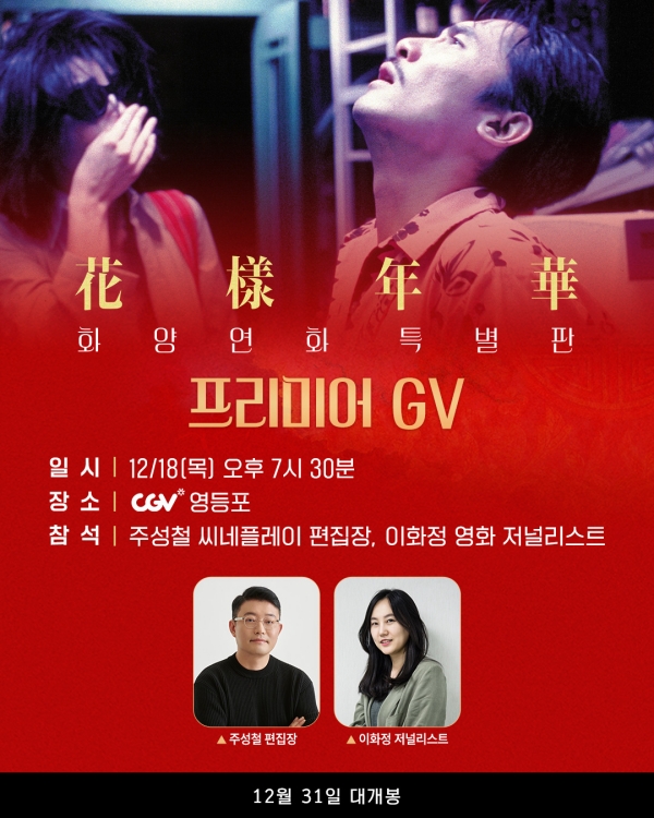 ¿À´Â 12¿ù 18ÀÏ ¿ÀÈÄ 7½Ã 30ºÐ, CGV ¿µµîÆ÷¿¡¼ ÁøÇàµÇ´Â ÇÁ¸®¹Ì¾î GV°¡ ±×°ÍÀÌ´Ù. À̹ø GV´Â ¿µÈ »ó¿µ ÈÄ ¾à 1½Ã°£ µ¿¾È ¾¾³×Ç÷¹ÀÌ ÁÖ¼ºÃ¶ ÆíÁýÀå°ú ¿µÈ Àú³Î¸®½ºÆ® ÀÌÈÁ¤ÀÌ ÇÔ²²ÇØ ÀÛǰ¿¡ ´ëÇÑ ½Éµµ ±íÀº ´ëȸ¦ ³ª´ ¿¹Á¤ÀÌ´Ù.