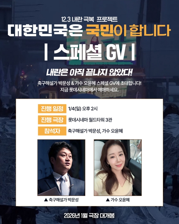 ÇÑÆí '´ëÇѹα¹Àº ±¹¹ÎÀÌ ÇÕ´Ï´Ù'´Â ¿¬¸» ¿¬½Ã¿¡ 12.3 ºñ»ó°è¾öÀ» ÇÔ²² ³Ñ¾î¿Â ÁöÀεé°ú ¿µÈ¸¦ °ü¶÷ÇÏ·Á´Â ´Üü°ü¶÷ ¹®Àǰ¡ ¿À´Â µî ¹ÝÀÀÀÌ °¥¼ö·Ï ¶ß°Å¿öÁö°í ÀÖÀ¸¸ç ÇÑ ¹ø ¿µÈ¸¦ °ü¶÷ÇÑ °ü°´µéÀº Àý´ëÀû ÁöÁö¸¦ º¸³»°í ÀÖ¾î À£¸ÞÀÌµå ´ÙÅ¥¶ó´Â È£ÆòÀ» ÀÔÁõÇϰí ÀÖ´Ù. ¾ÕÀ¸·Îµµ ±ô¦ ¸±·¹ÀÌ GV°¡ °è¼Ó µÉ '´ëÇѹα¹Àº ±¹¹ÎÀÌ ÇÕ´Ï´Ù'´Â 2026³â 1¿ù ±ØÀå¿¡¼ ¸¸³¯ ¼ö ÀÖ´Ù.