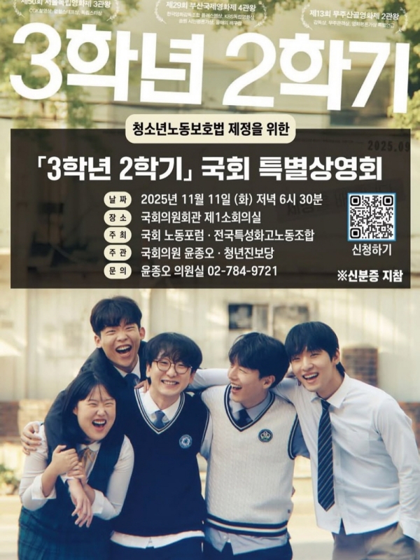 ¿µÈ '3Çгâ 2Çбâ'°¡ 11¿ù 11ÀÏ(È) Àú³á 6½Ã 30ºÐ, û¼Ò³â³ëµ¿º¸È£¹ý Á¦Á¤À» À§ÇÑ ±¹È¸ Ưº°»ó¿µÈ¸¸¦ °³ÃÖÇÑ´Ù. À̹ø »ó¿µÈ¸´Â ±¹È¸ ³ëµ¿Æ÷·³°ú Àü±¹Æ¯¼ºÈ°í³ëµ¿Á¶ÇÕÀÌ ÁÖÃÖÇϰí, Áøº¸´ç À±Á¾¿À ÀÇ¿ø°ú û³âÁøº¸´çÀÌ ÁÖ°üÇÑ´Ù. '3Çгâ 2Çбâ'´Â ¼ö´É ´ë½Å ÇöÀå½Ç½ÀÀ¸·Î »çȸ¿¡ ù¹ßÀ» ³»µó´Â ¿¾ÆÈ© »çȸ Ãʳâ»ýµéÀÇ À̾߱⸦ »ç½ÇÀûÀ¸·Î ±×·Á³½ ÀÛǰÀÌ´Ù. À±Á¾¿À ÀÇ¿øÀº 2017³â ¡®LGÀ¯Ç÷¯½º Ư¼ºÈ°íÇöÀå½Ç½À»ý»ç¸Á»ç°ÇÁø»ó±Ô¸íÀ» À§ÇÑ °øµ¿´ëÃ¥À§¡¯¿Í ÇÔ²² °øµ¿ÁÖÃÖÇÑ Åä·Ðȸ¿¡¼ ¡°ÇöÀå½Ç½À°úÁ¤¿¡¼ ¹Ýº¹µÇ´Â ºÒÇàÇÑ »ç°í¸¦ ¹æÁöÇϱâ À§ÇØ Ã¥ÀÓÀÚó¹ú°ú ±¹È¸ ¹× Á¤ºÎÀÇ Á¦µµ °³¼±ÀÌ ÇÊ¿äÇÏ´Ù¡±¸ç û¼Ò³â³ëµ¿º¸È£¹ý Á¦Á¤À» ²ÙÁØÈ÷ ÁÖÀåÇØ ¿Ô´Ù. À̹ø ±¹È¸ Ưº°»ó¿µÈ¸´Â À±Á¾¿À ÀÇ¿øÀÇ ¹®Á¦Àǽİú ¿µÈ '3Çгâ 2Çбâ'ÀÇ ¸¸³²À¸·Î, û¼Ò³â ³ëµ¿ Çö½Ç¿¡ ´ëÇÑ Á¦µµÀû º¯È¸¦ ¸ð»öÇÏ´Â À¯ÀǹÌÇÑ ÀÚ¸®°¡ µÉ °ÍÀ¸·Î ±â´ëµÈ´Ù. »ó¿µ Àü À̶õÈñ °¨µ¶°ú À¯ÀÌÇÏ ¹è¿ìÀÇ ¹«´ë Àλ簡 ¿¹Á¤µÇ¾î ÀÖÀ¸¸ç, Âü¿© ½ÅûÀº https://forms.gle/1MfehYrAAfKEEQq37¿¡¼ °¡´ÉÇÏ´Ù.